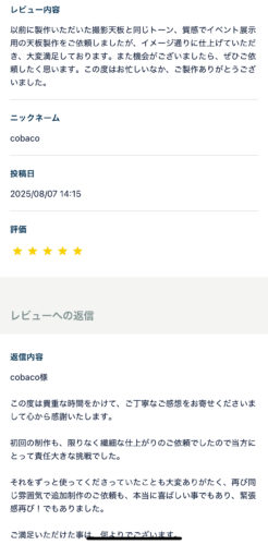 以前に製作いただいた撮影天板と同じトーン、質感でイベント展示用の天板製作をご依頼しましたが、イメージ通りに仕上げて頂き、大変満足しております。また機会がございましたら、ぜひご依頼したく思います。
